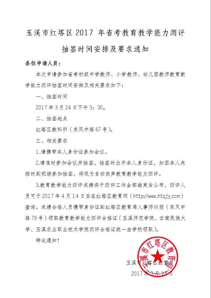 玉溪市红塔区2017年省考教育教学能力测评通知