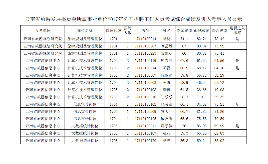 云南省旅游发展委员会所属事业单位2017年招聘综考察公示