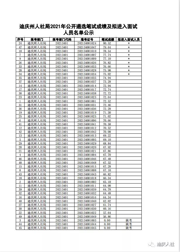 根据《迪庆州人力资源和社会保障局2021年公开遴选公务员公告》应考人员49名,实际参考46名,现将46名考生笔试成绩及拟进入面试人员进行公示,如有异议可于11月25日前向州人社局反应,咨询电话0887-8881963。注:面试其它事宜由工作人员电话通知到考生本人,如不能参加本次面试的,请于11月24日前书面提交放弃申请,我们将根据笔试成绩排名在面试前依次进行替补。