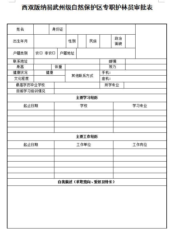 3.报名地点:西双版纳易武州级自然保护区管护局办公室(勐腊县林业和草原局办公楼附楼)