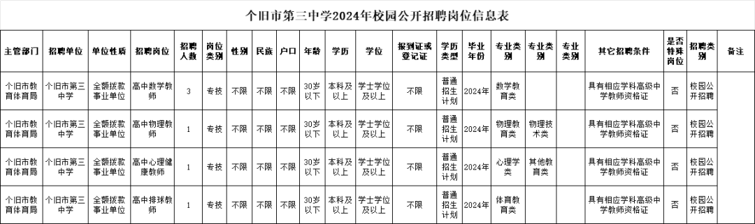 详见《个旧市第三中学2024年校园招聘岗位信息表》。(附件1)