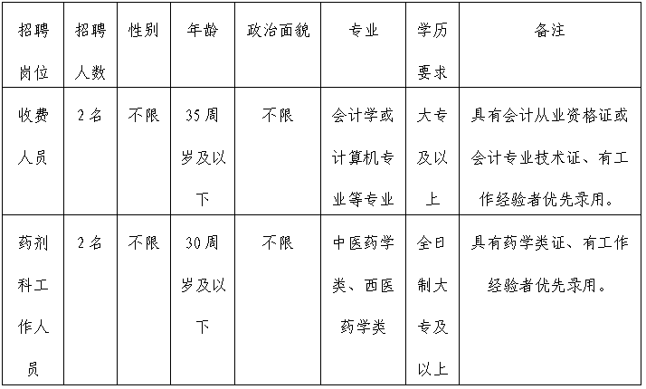 为加强元阳县中医医院人才队伍建设,改善人才队伍结构,优化医院的人力资源配置,提高医院医疗、护理质量,促进卫生健康事业可持续发展,根据我院用人需求,“公开、平等、竞争、择优、德才兼备”的招聘原则,现面向社会公开招聘人员4名(收费人员2名、药剂科工作人员2名),现将有关具体事项公布告如下: