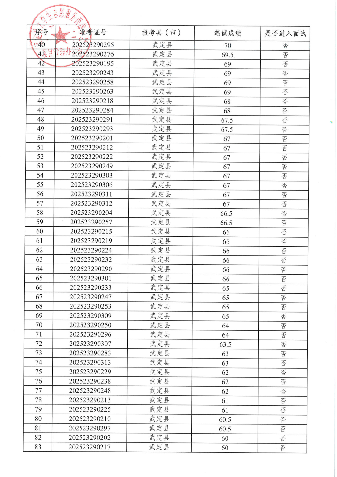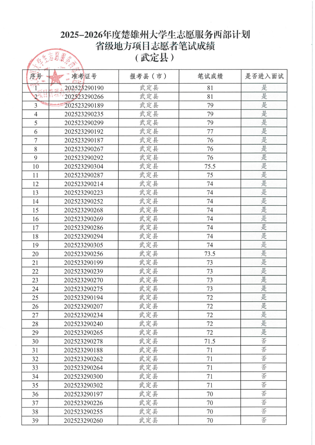 武定县2025—2026年度大学生志愿服务西部计划地方项目招募笔试成绩公告及面试安排