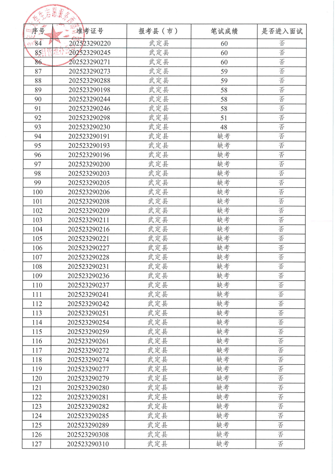 根据共青团云南省委、云南省教育厅、云南省财政厅、云南省人力资源和社会保障厅《关于印发〈2025—2026年度云南省大学生志愿服务西部计划实施方案〉的通知》和云南省大学生志愿服务西部计划项目管理办公室《关于做好2025—2026年度云南省大学生志愿服务西部计划地方项目志愿者招募派遣工作的通知》要求,武定县2025—2026年度计划招录大学生志愿服务西部计划省级地方项目志愿者9名。通过报名资格审核127人,武定县项目办于2025年6月14日下午组织开展了志愿者笔试,现对笔试成绩予以公告。