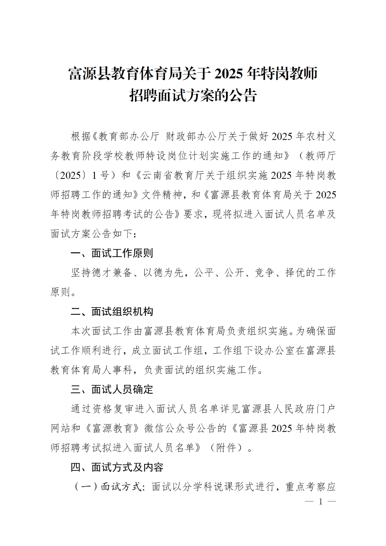富源县教育体育局关于2025年特岗 面试方案的公告