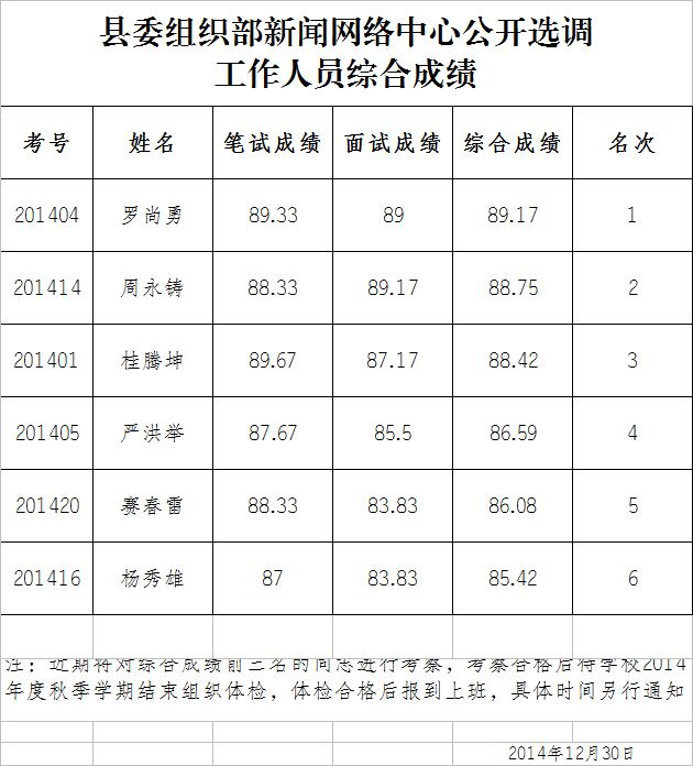 昭通市盐津县委组织部2014年公开选调工作人员综合成绩公示